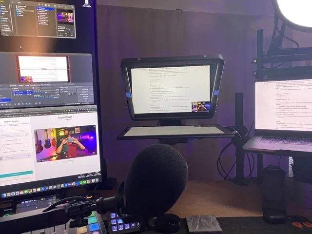 I really wanted to be able to make pretty decent eye contact while filming, so I invested in a teleprompter setup where the camera sits behind a reflective glass and the image from my external monitor (or ipad) is reflected onto that glass. This allows me to have my notes literally on top of the camera lens.